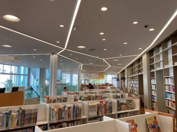 低書架やレイアウトだけでなく、設計の段階でフロア構築や照明に工夫してる様子が分かります。